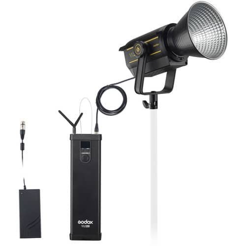 Moving the V-mount battery plates and light controls out of the light body and into the standalone control box allows easily placing the light wherever it needs to be without the added bulk and weight of large V-mount cells. The controller box comes complete with a 4-pin XLR type power cable for easy placement. It features an antenna for the separately-available wireless radio remote, and a Bluetooth antenna for using the GodoxPhoto app on iOS or Android portable devices.