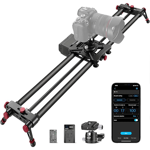Powerful yet Silent Motor The ER1-120 slider is powered by an upgraded powerful motor, providing smooth and silent camera movement for video production without worrying about buzzing background noise. Use the included 2600mAh NP-F550 lithium ion battery and USB charger, or the 5V 2A type C power jack to connect to a portable charger to power the motor and start filming for hours on end